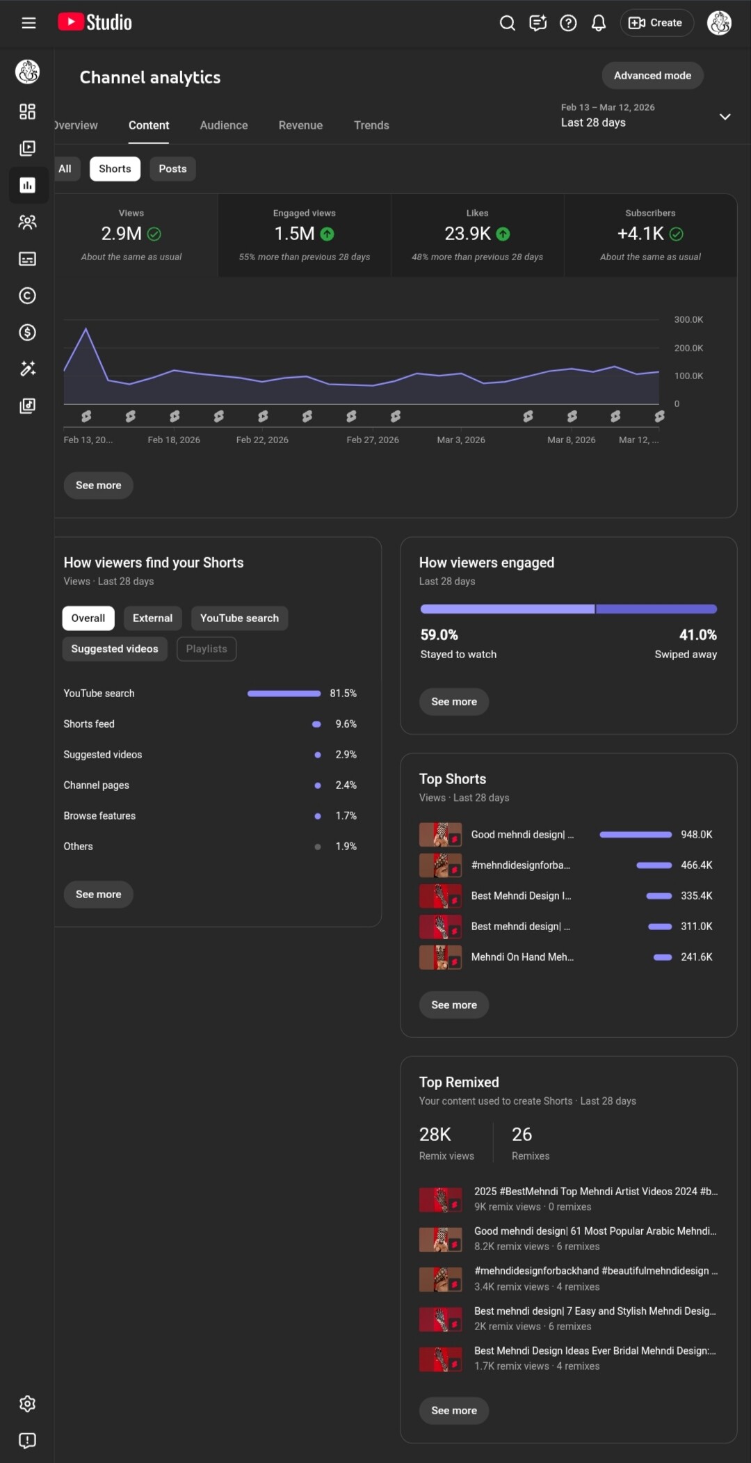 The channel receives consistent traffic mainly from YouTube Shorts and YouTube Search, with 2.9M views in the last 28 days.