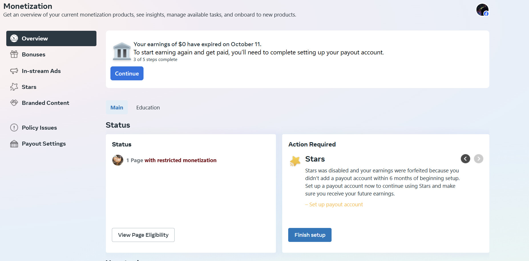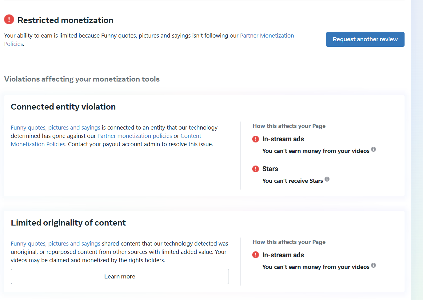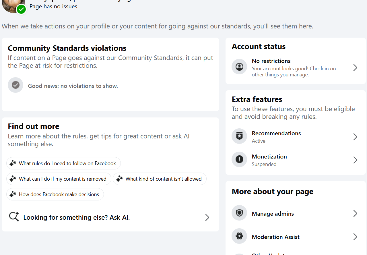The page is completely green except monetization (Instream Ads got demonetized) other than that, page has no Violations, Strikes or any issues.