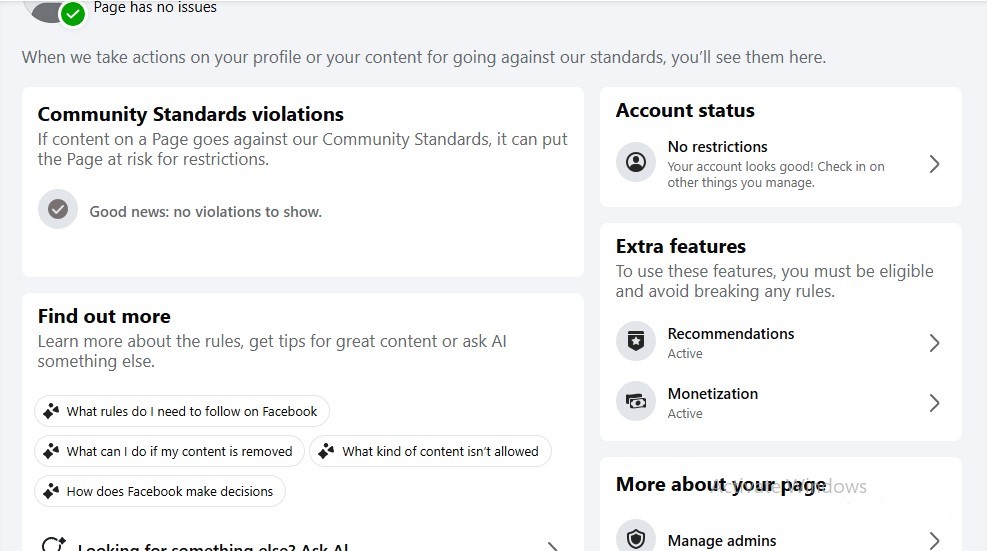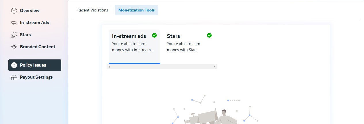 This FB page has Content Monetization setup with In-Stream Ads enabled. green quality status, without any restrictions or violations.