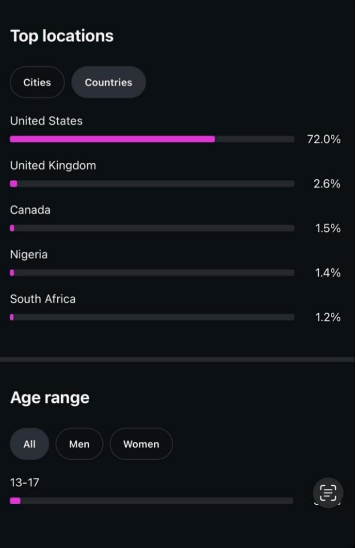 The account maintains steady engagement with a highly monetizable geographic audience.