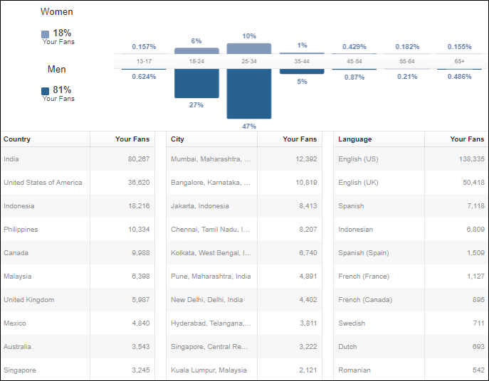 Country of followers (majority): 80k India, 36k USA…