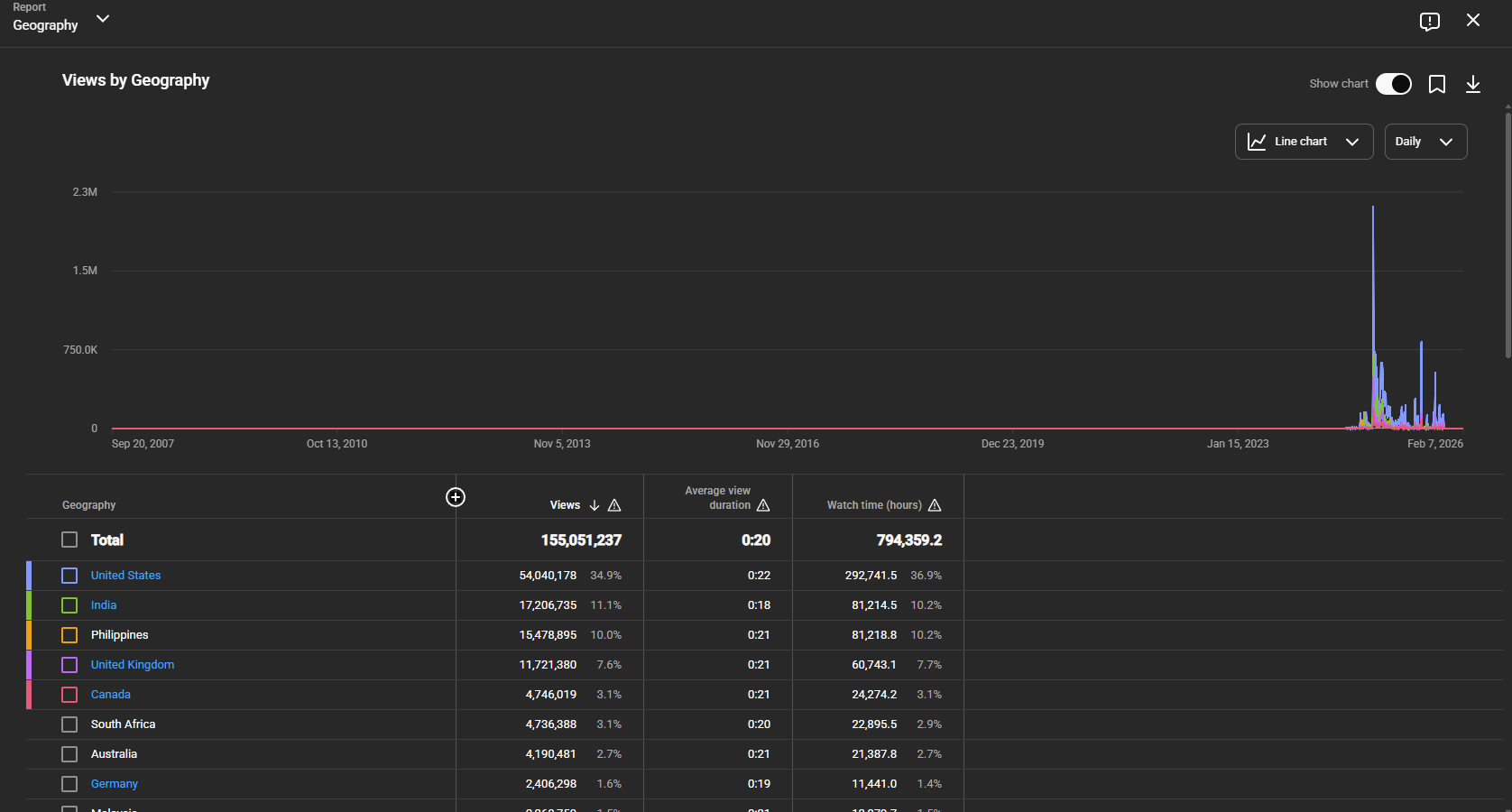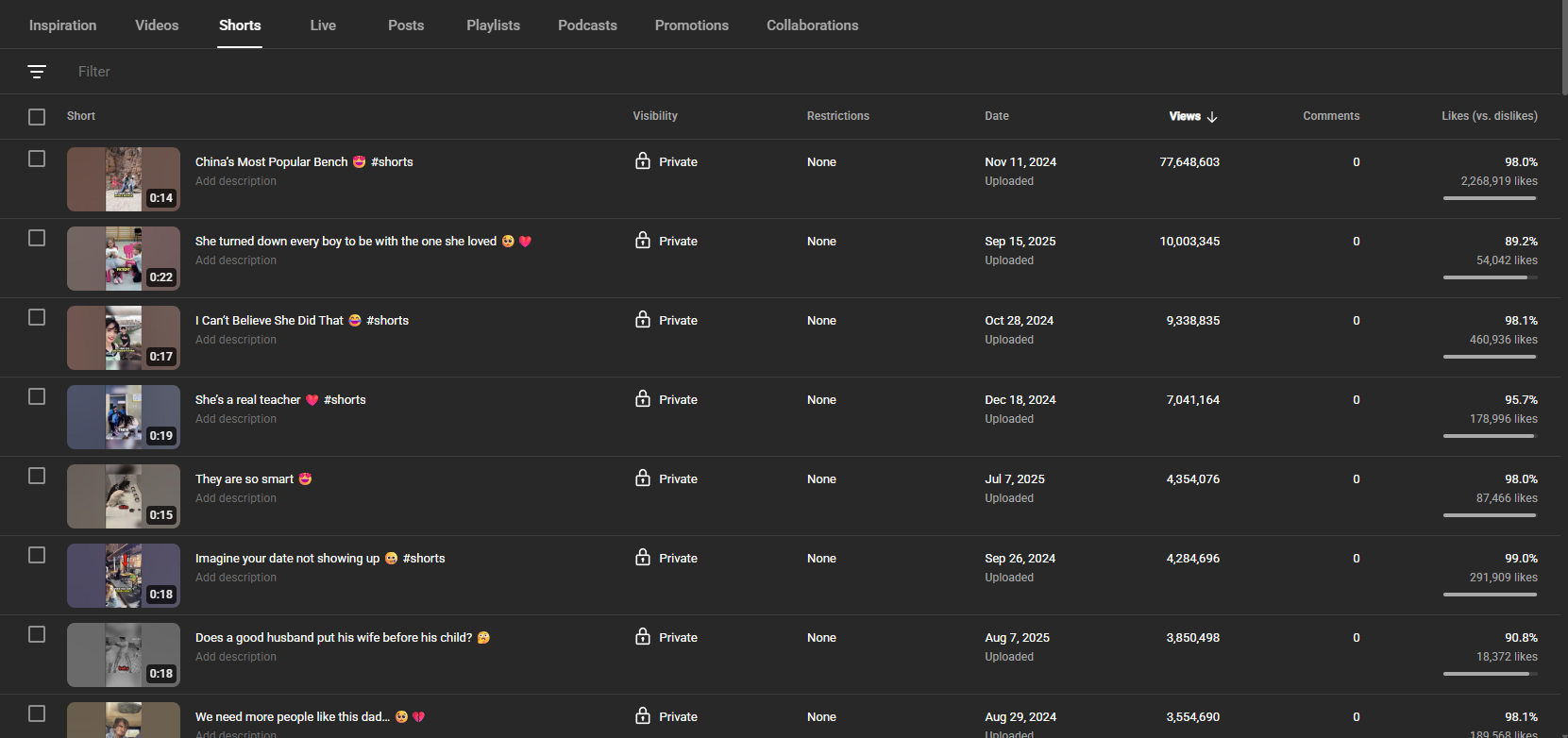 Description: The top view demographic on this channel is USA and the views are from viral shorts videos! All 700+ of the shorts on the channel are currently privated so the channel appears empty. The channel is also extremely old, having been created in 2007, and growth began in early 2024.