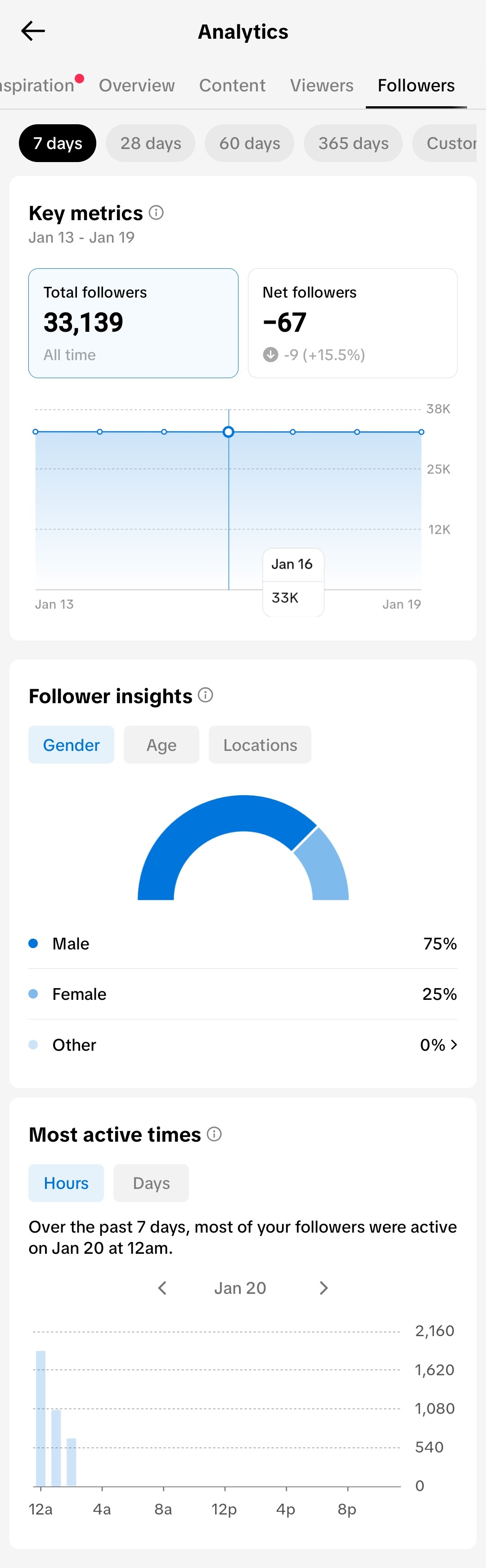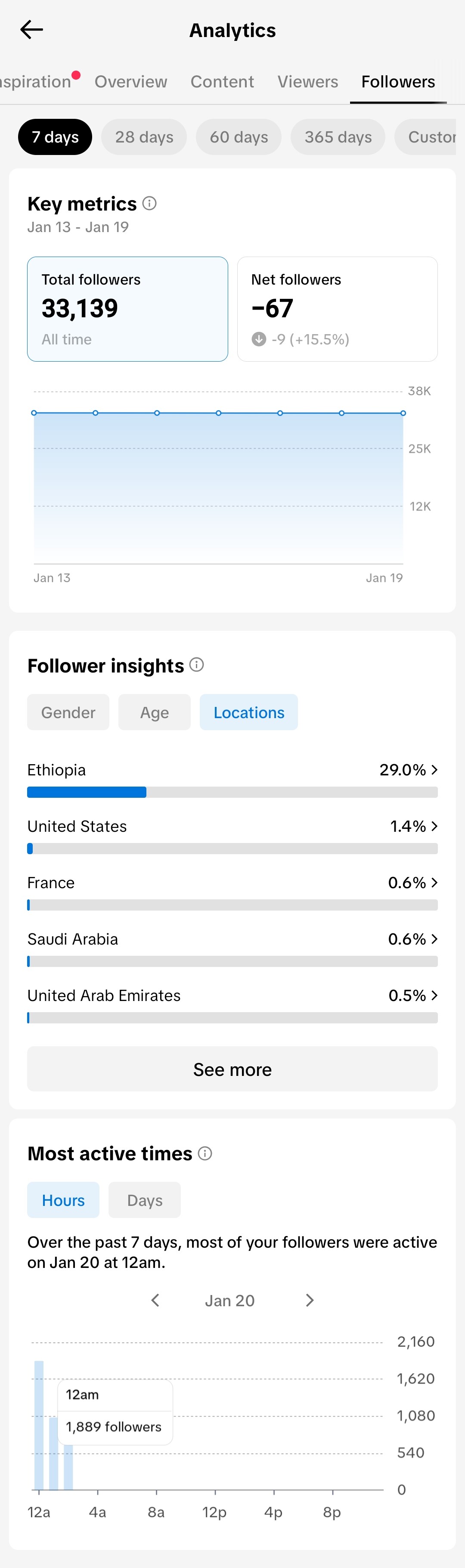 Active and organic TikTok account with 33.1K+ followers and 571.9K+ total likes. The audience is highly engaged, with 75% male and 25% female followers. A significant portion of the audience (29%) is based in Ethiopia, followed by the United States and France. Several videos have reached over 100K views, showing great viral potential. Perfect for creators or businesses looking to reach the Ethiopian and international market.