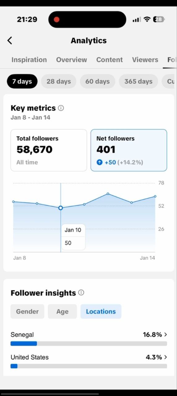 Country of followers (majority): Senegal, USA, Ghana, Nigeria