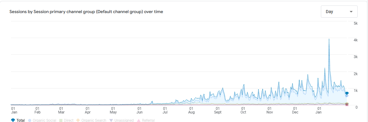 Traffic peaked in recent months and shows consistent discovery, especially from organic social and search.