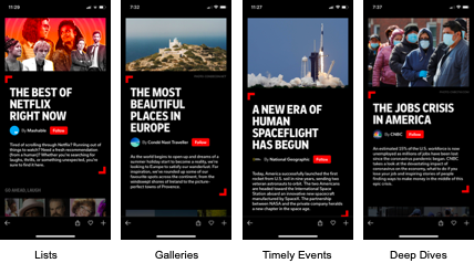 They enable the creator room for a headline, description and the ability to organize content into sections. Having a beginning, middle and end to the collection allows you to present your coverage in a way that tells a bigger story. There is a follow button at the top of the Storyboard that allows readers to easily follow your Flipboard profile. Beyond discovering these in Flipboard, the new units are designed to be highly shareable to extend your reach off Flipboard.