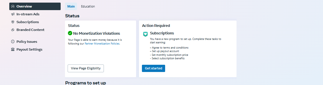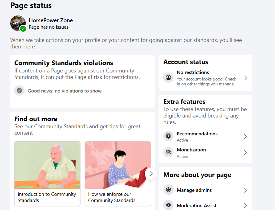 - Monetization: Eligible for Subscriptions (action required to set up), no monetization violations, all green status. Ready for FB Stars and Branded Content with setup.