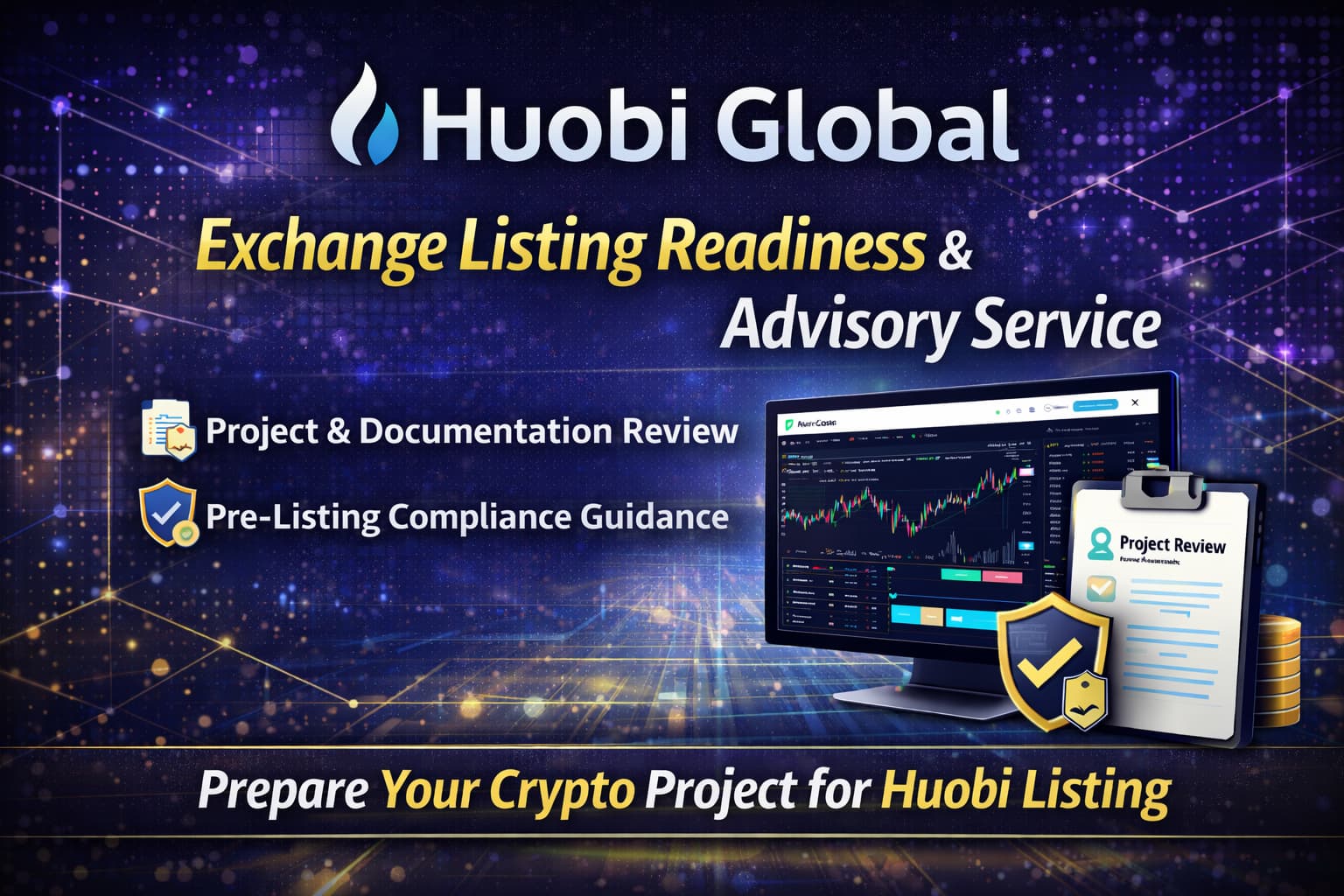 This service focuses on project structuring, documentation preparation, compliance alignment, and listing readiness review, helping teams understand Huobi’s general expectations and improve their project presentation before submission.