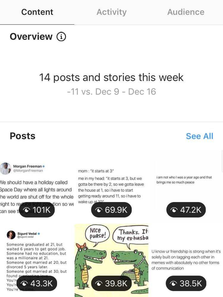 Description: This is a nice account which was rebranded from a different niche. Used to have 20-70k likes now averages between 3k and 6k. Thanks to the insane username it has huge room to grow and gain back the reach it had. Because of various reasons i can barely post 2-3 times a week, which is why impressions and reach aren’t great atm.