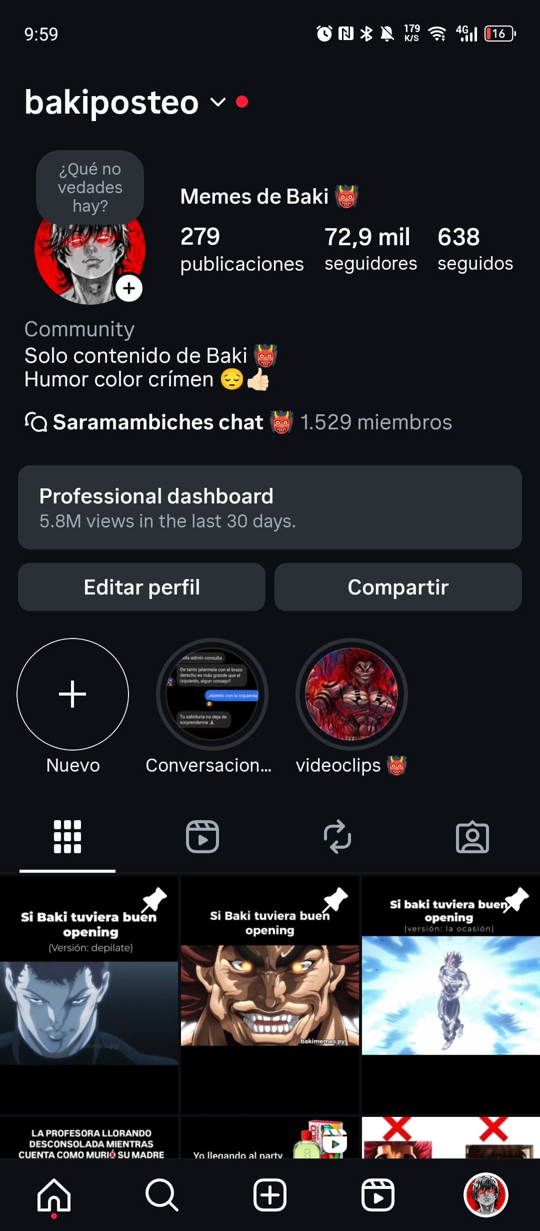 Description: IG meme page focused on the anime Baki, with a highly engaged Spanish-speaking audience (mostly from Latin America). The page has grown rapidly through organic reach and viral Reels, with no paid ads or engagement groups used. In the last 30 days, it reached 6M+ views, 1.5M+ interactions, and gained 5,174 new followers — all from just 15 shared posts.