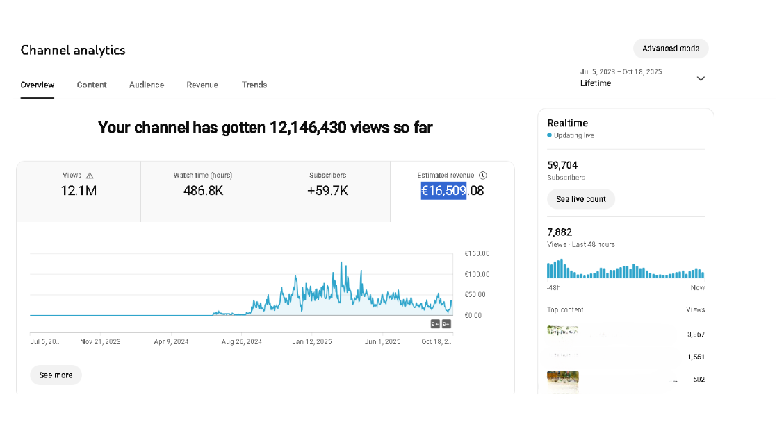 This monetized YouTube channelis already producing revenue and showing strong growth potential. With 59.7K + subscribers, 12.1M+ views, and 486.8K watch hours** , the channel has generated **