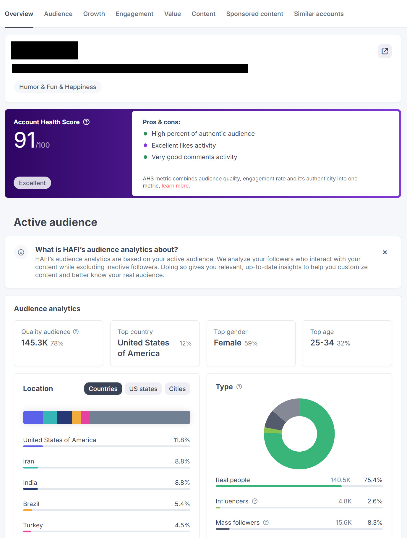 - Account Score: 91/100 (Excellent). Top 1% quality account with 75% verified real people.