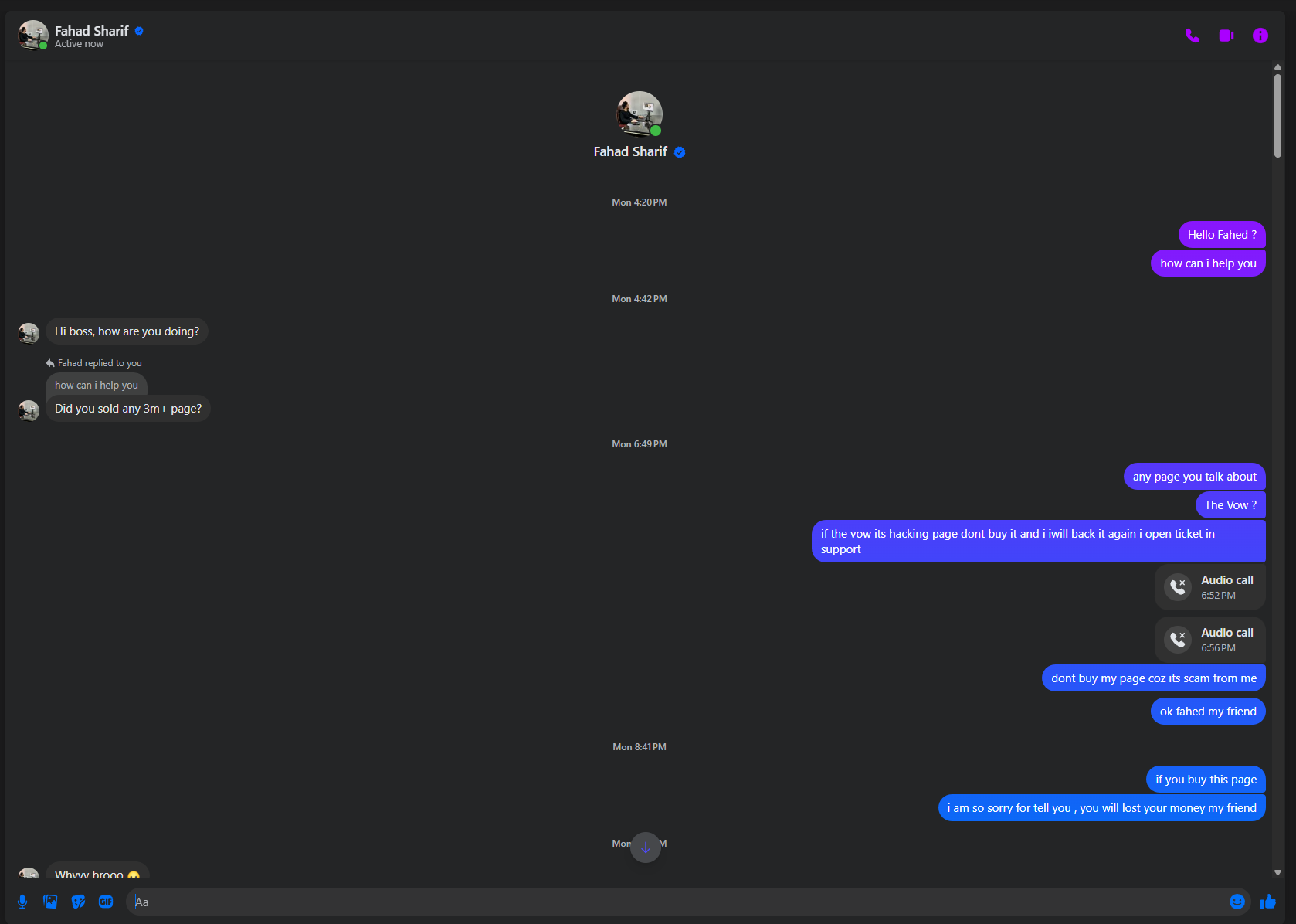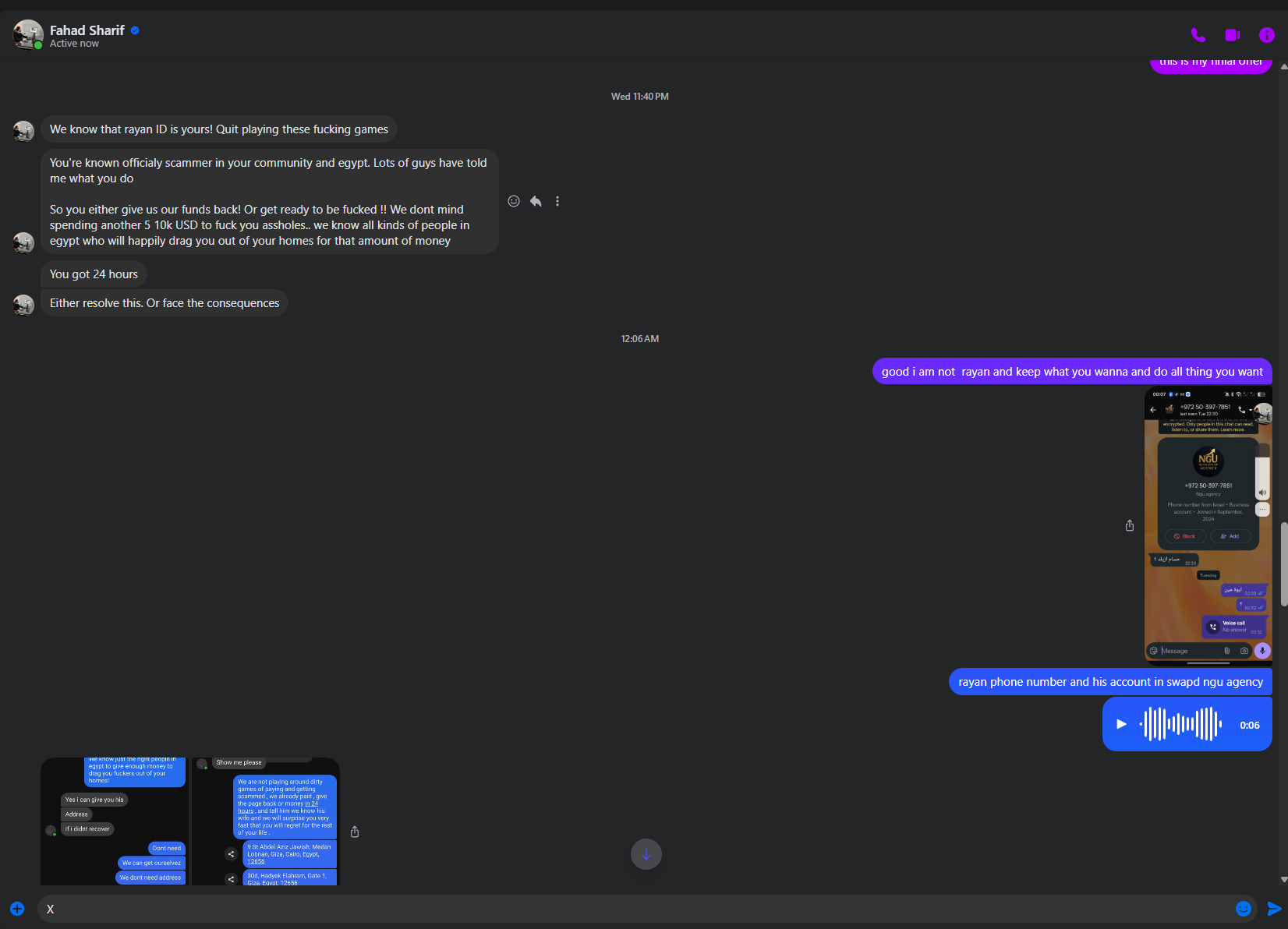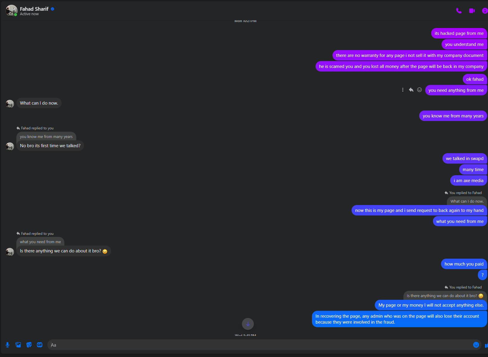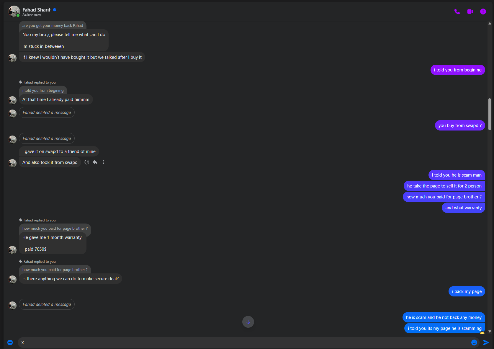 I handed over a page for sale to a Palestinian outside the platform to sell to someone in America via swapd, and I received payment for it. the user here his account us With a one-month guarantee - The person sold it to another American here, and the money was received with complete integrity and there were no problems. The page was returned to my account within 5 days, but the Palestinian person here with an account named "NGU.AGENCY " did not return the page to the main customer and sold it again to someone here named " Fahed “ and Fahed Contact me out side of swapd and told me you have page for sale 3+ i told him this is scamed page don’t buy it coz you not need to losted your money Because the page has already been sold, I will either return it to the first customer or give them a refund. after that 1 day i go to fahed to ask he reback the money or not he told me not and he start to By threatening me and claiming that I am the same person - I have a screenshot that I will use as proof.