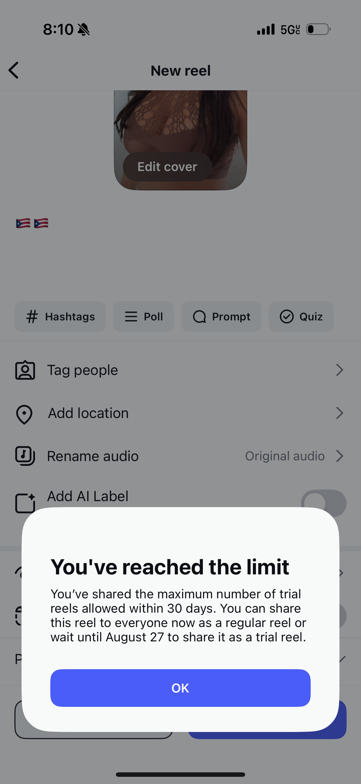 I’ve hit the max number of trial reels allowed in 30 days on Instagram and got this pop-up saying I can’t post another trial reel until August 27. I’m looking for a reliable associate or method to bypass this limit and keep posting trial reels without waiting.