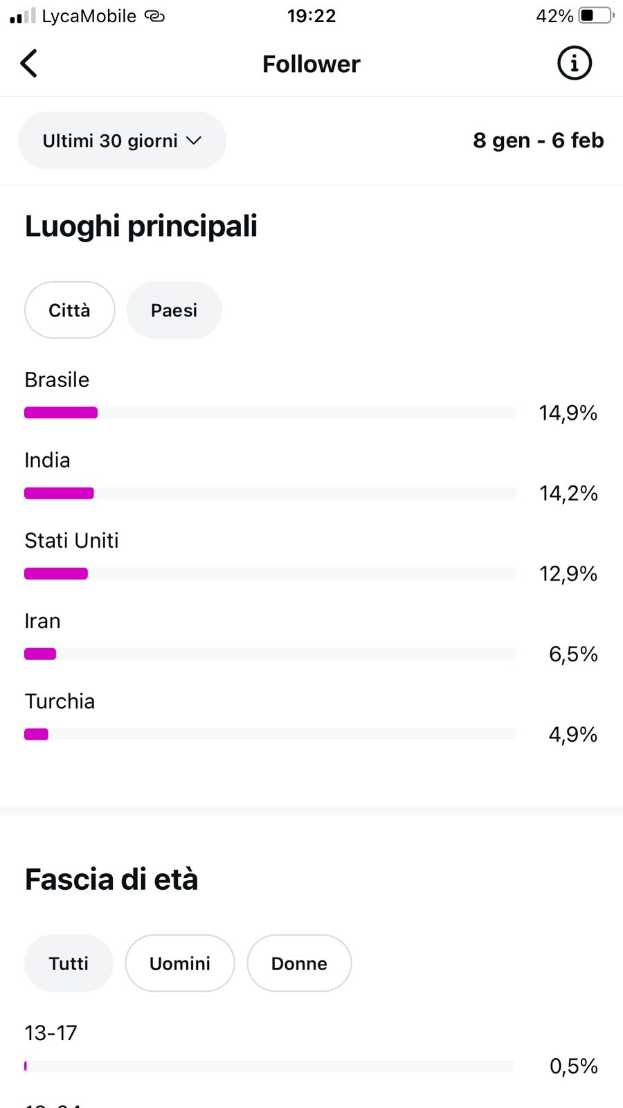 Country of followers (majority): 1. Brasil 2. India 3. USA