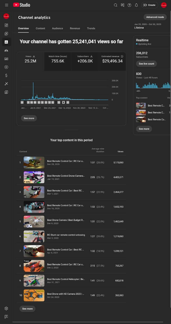 Monetized tech/gadget YouTube channel with 206K+ subscribers, 25M+ lifetime views, and $29,496 total revenue.