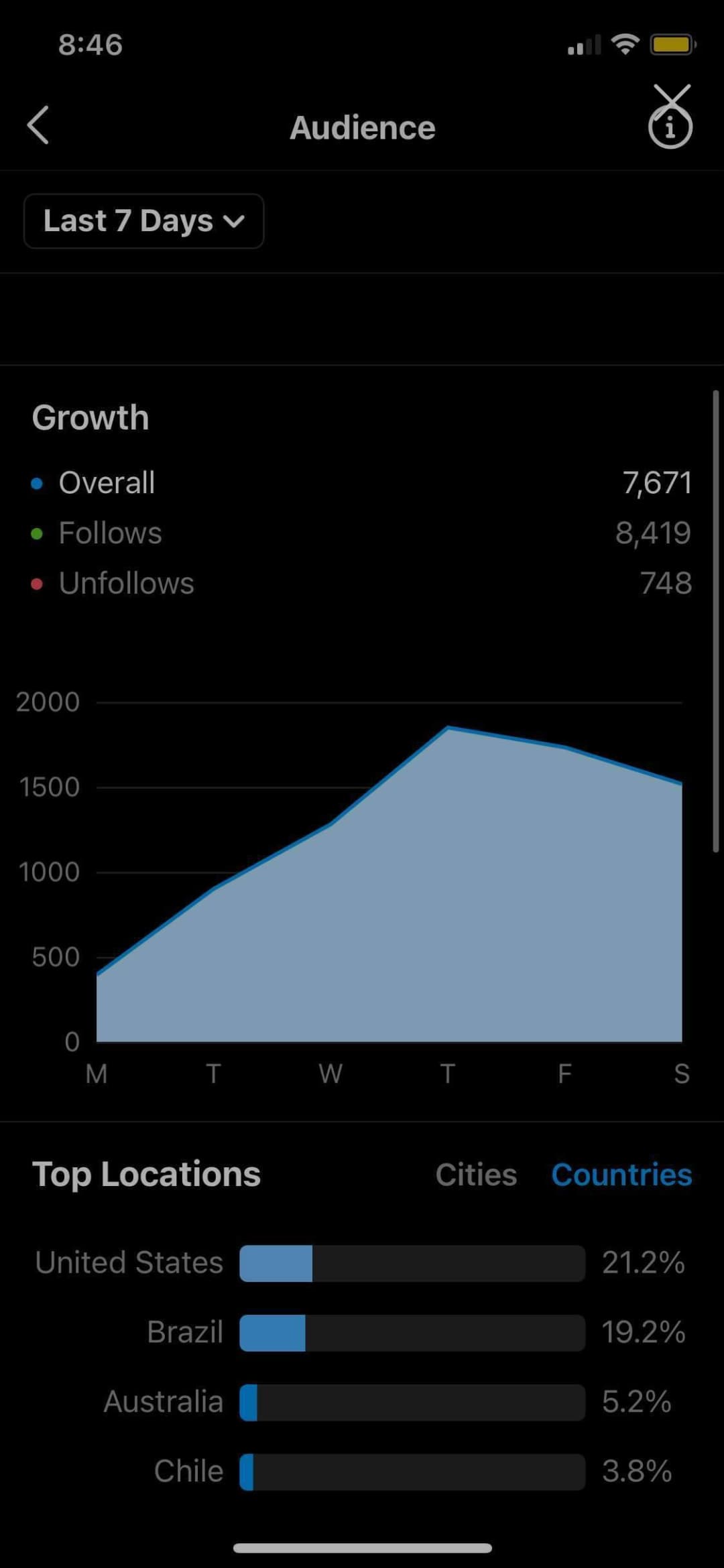Country of followers (majority): USA 20% - Brazil 20% - Australia 5%