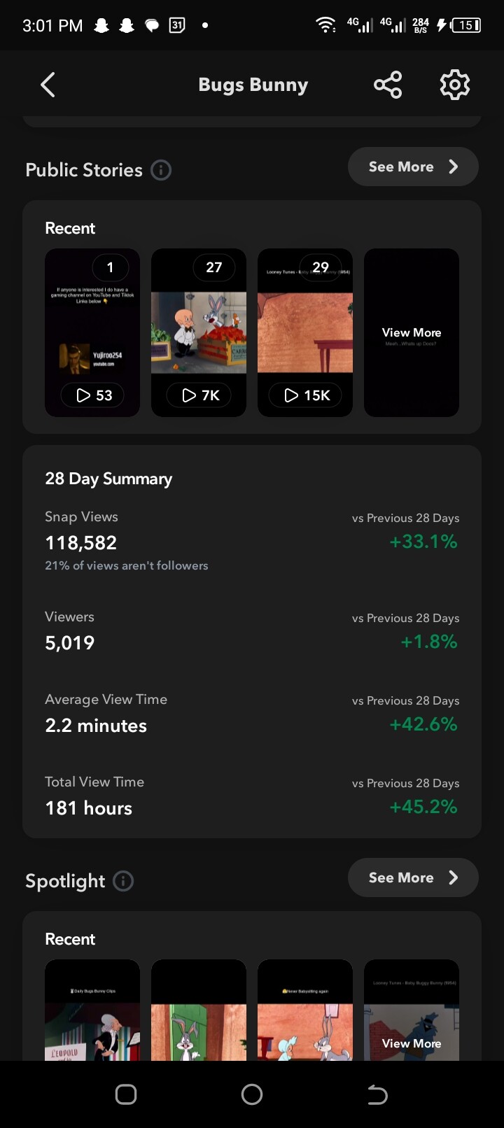The account post daily animation content on both spotlight and public story. Followers are organic and are from spotlight views.