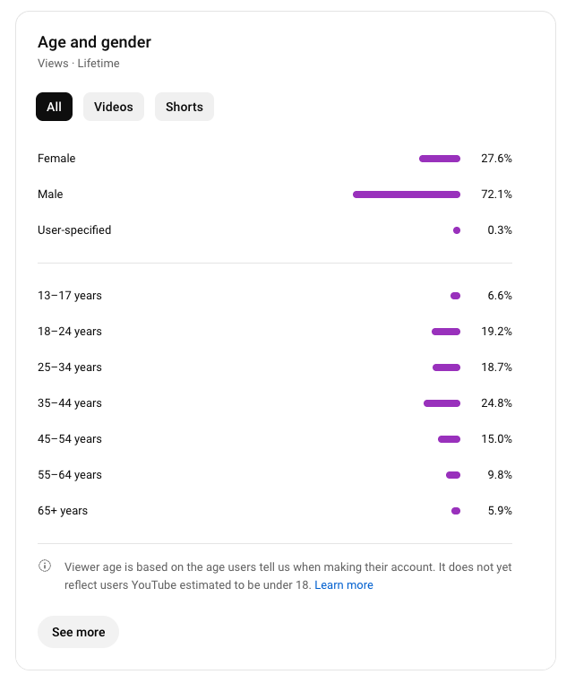 Strong 25–44 demographic - mature, engaged, and highly monetizable.