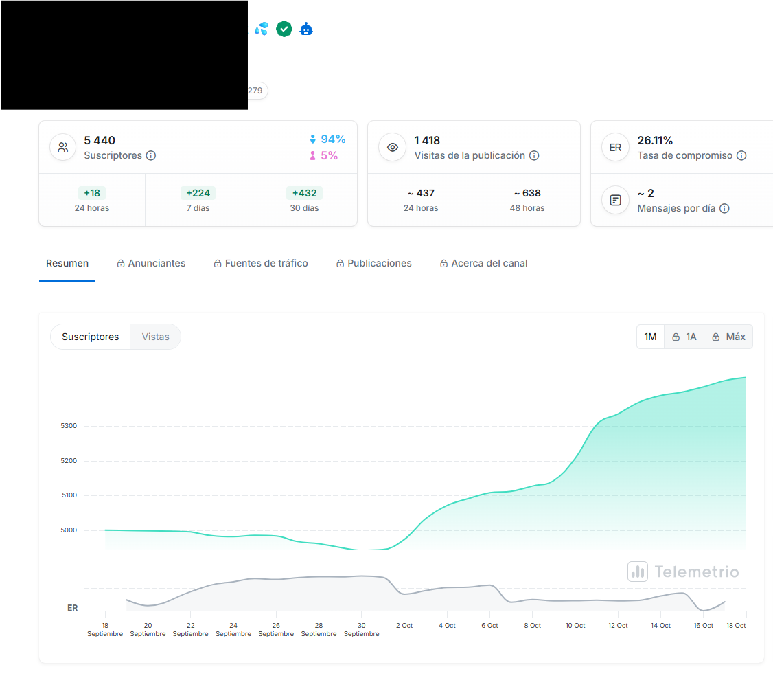 Description: 18+ Telegram channel with organic followers coming from my other channels. Followers from all over the world (mostly Spanish-speaking). I post new content every two or three days, so it’s an active channel that continues to gain impressions and reactions. If you need more information, feel free to contact me.