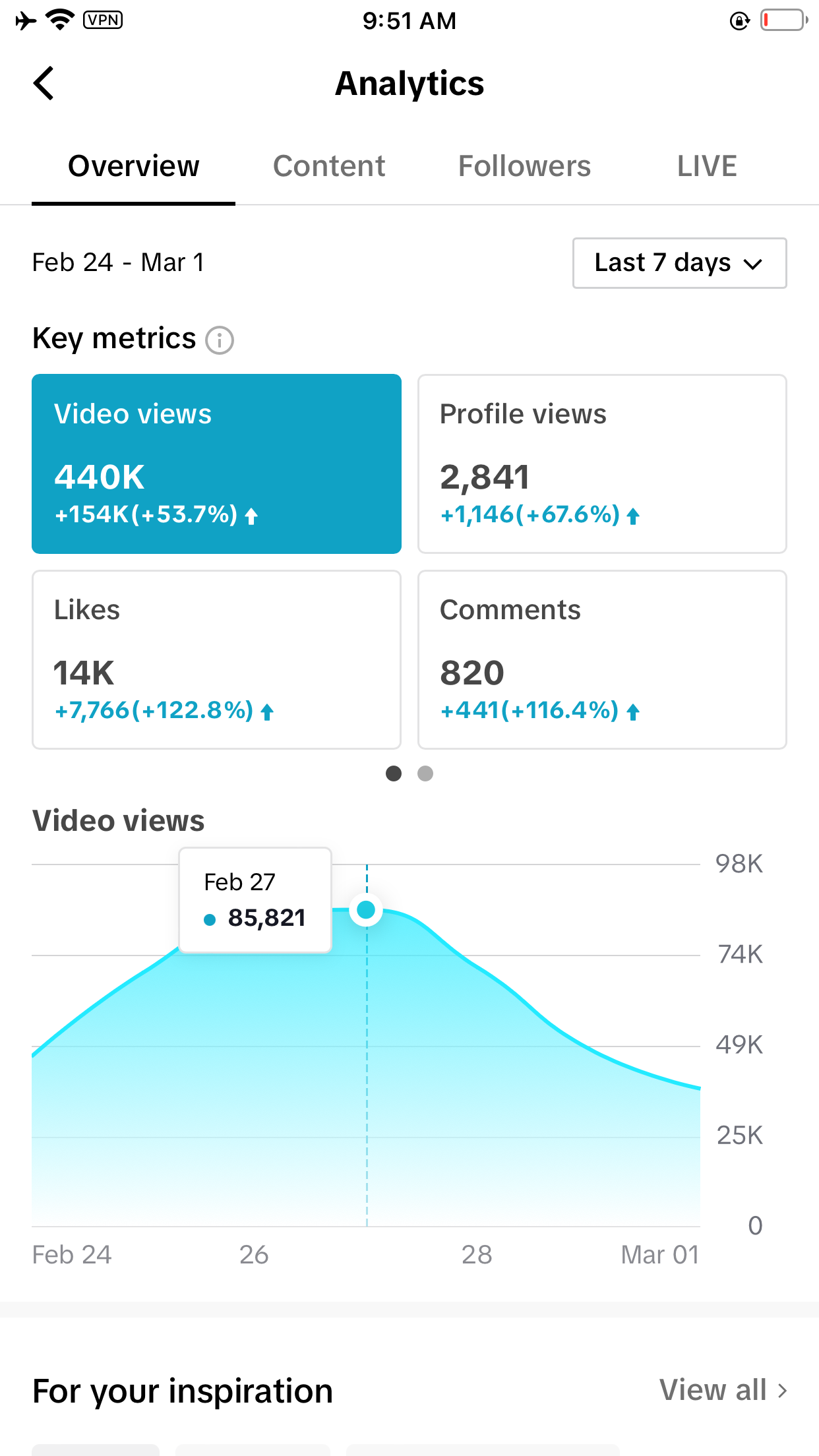 A TikTok account with a high number of followers, views, and likes will give new videos a higher chance of going viral.