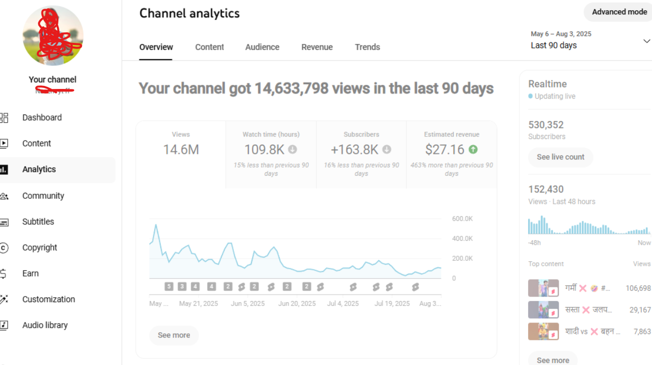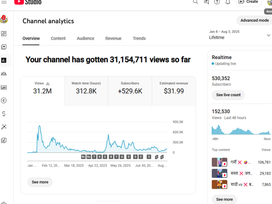 Hi, I am selling a high active channel that has 520000+ subscribers and is getting around 150k views every 48 hours and 2.8 Million views in last 28 days, the channel is earning from shorts for now, however you can adapt the channel to long form content. The channel has gained 25-30k in last 28 days.
