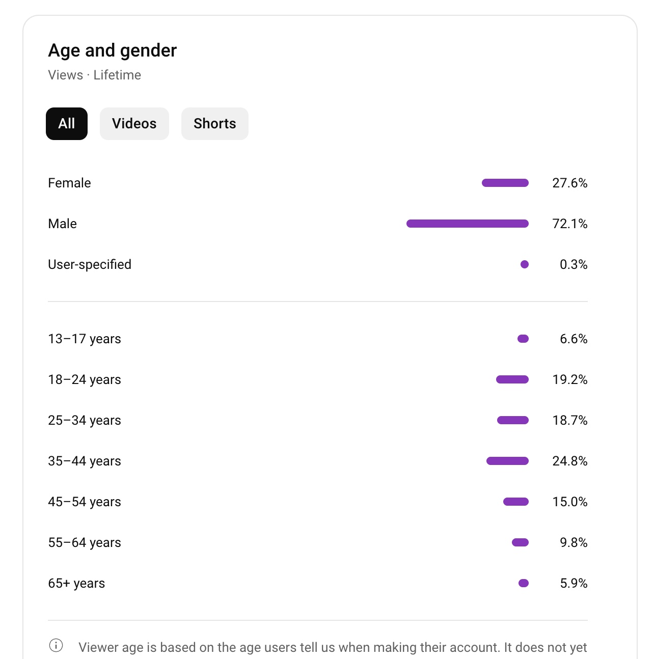 69% of the audience is 25+ → mature, monetizable & high CPM potential